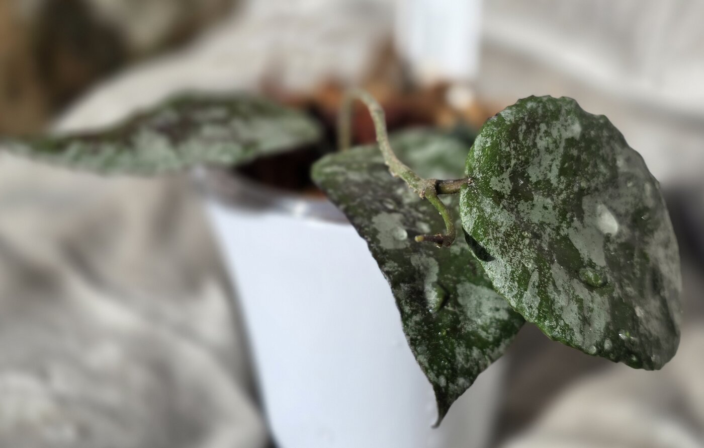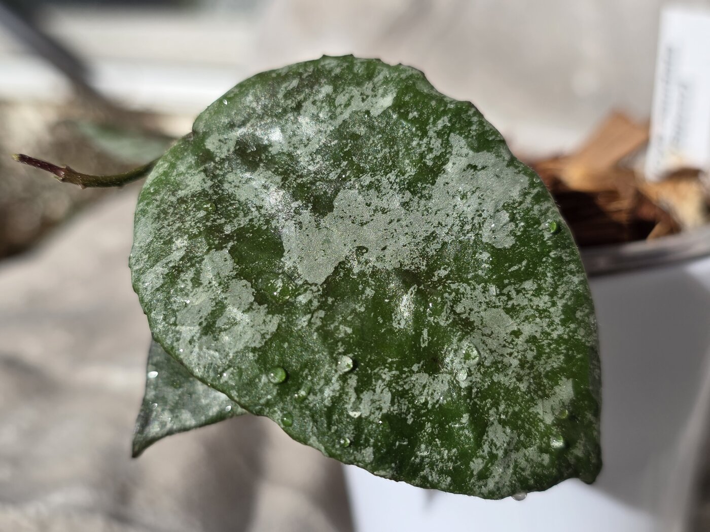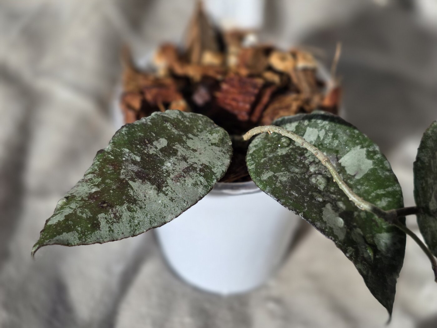 A beautifully elegant Hoya with crinkly, silver-edged leaves.